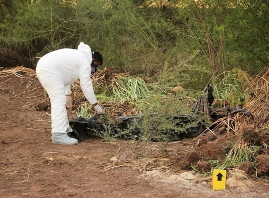 GUASAVE._ El conductor de un trascabo que realizaba trabajos de limpieza en un dren agrícola en la sindicatura de El Burrión desenterró la osamenta de una persona que al parecer tenía de tres a seis meses de haber sido envuelta en hule y enterrada.