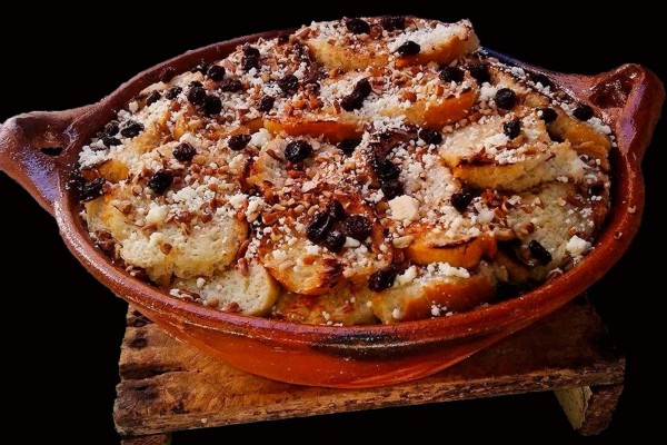 En sí, es un platillo dulce que consiste en pan tostado o puesto a orear hasta que se deshidrata, cortado en rodajas que son puestas a cocer junto con trozos de plátano, pasas de uva y ciruela, nueces y cacahuates, cubierto con jarabe de piloncillo y queso seco.