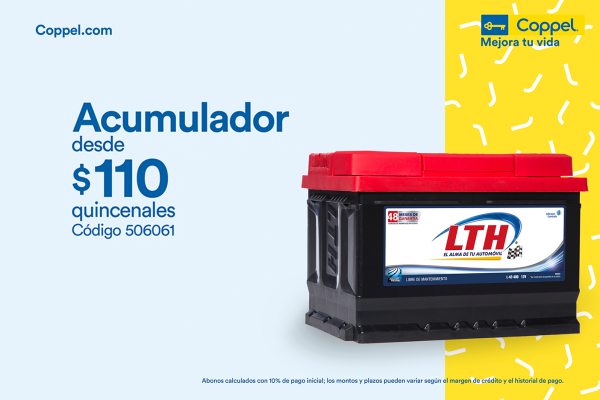 Como cualquier conductor sabe, un acumulador o batería de calidad es esencial para el buen funcionamiento de tu automóvil. Es por esto que Coppel ofrece lo mejor en acumuladores a los bajos precios y facilidades de pago que el público a llegado a esperar de esta prestigiosa tienda departamental.