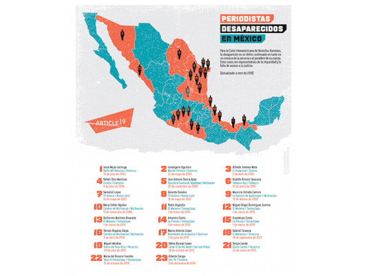 Artículo 19 tuvo conocimiento de que en el periodo 2003 a 2015, en promedio han desaparecido dos periodistas por año. Dijo que en Guerrero, Nuevo León, Coahuila, San Luis Potosí, Chihuahua, Sinaloa y Tabasco se tienen entre uno y dos casos de desapariciones.
