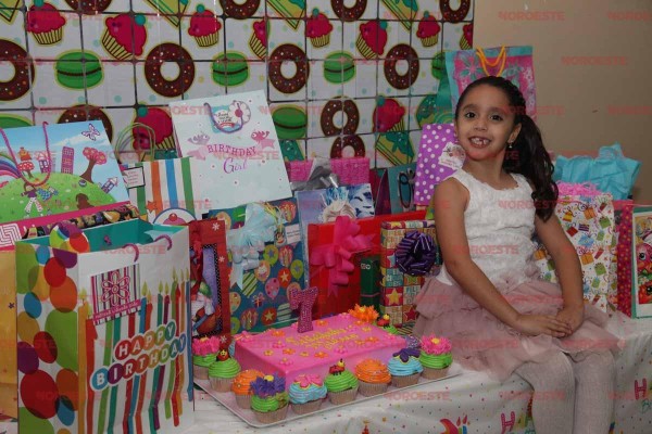 "En una divertida fiesta, la pequeña recibe felicitaciones de su familia y amigos"