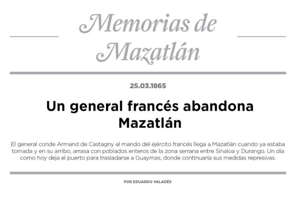 "El general conde Armand de Castagny al mando del ejército francés llega a Mazatlán cuando ya estaba tomada y en su arribo, arrasa con poblados enteros de la zona serrana entre Sinaloa y Durango. Un día como hoy deja el puerto para trasladarse a Guaymas, donde continuaría sus medidas represivas"