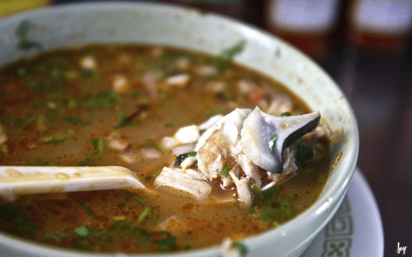 Sirve la sopa acompañado de col, jugo de limón, salsa picante y cebolla fileteada.