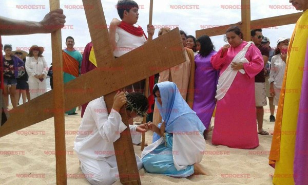 Mazatlán celebró uno de los Viacrucis más espectaculares del estado, tan solo por el hecho de que se realizó frente al mar, con las playas atiborradas de turistas, quienes dejaron de lado lo que esatban haciendo para ver el recorrido de Jesús hacia su calvario.