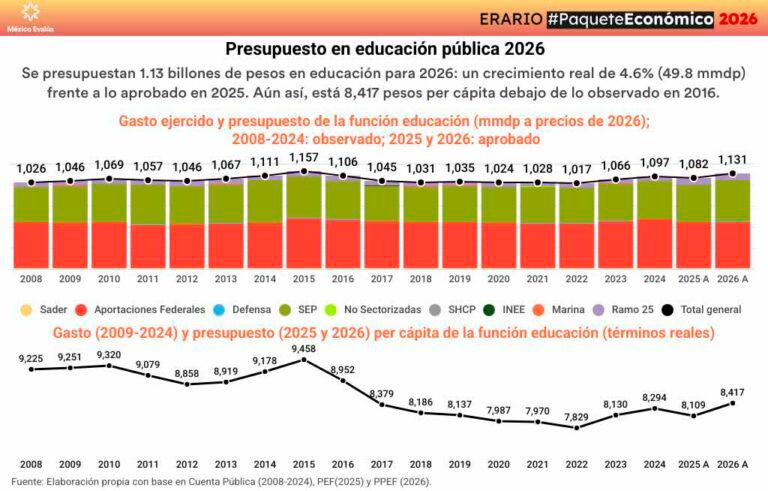 El gasto en educación quedará en 1.13 billones de pesos, lo que implica un crecimiento real de 4.6 por ciento (49.8 mil millones de pesos) respecto a 2025. Sin embargo, México seguirá invirtiendo cerca de 2.9 por ciento del PIB en esta materia, lejos del 3.5 por ciento del PIB alcanzado en 2015 y muy por debajo del estándar de 4 a 6 por ciento recomendado por la Organización de las Naciones Unidas para la Educación, la Ciencia y la Cultura (Unesco).