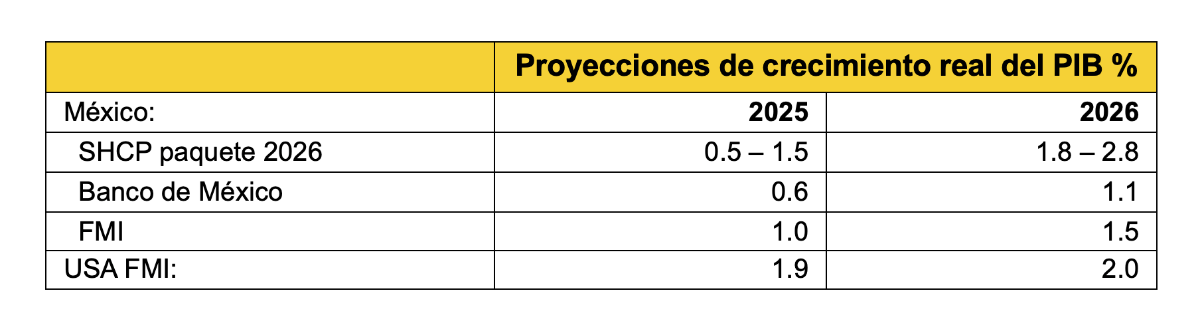 - El Marco Macroeconómico resulta optimista particularmente en lo referente al crecimiento económico. Para 2025 se estima un cierre de crecimiento real del PIB entre 0.5 y 1.5 por ciento. Para 2026 el rango estimado es de entre 1.8 y 2.8 por ciento real. Estas cifras se encuentran por arriba de estimados internacionales y del propio Banco de México.