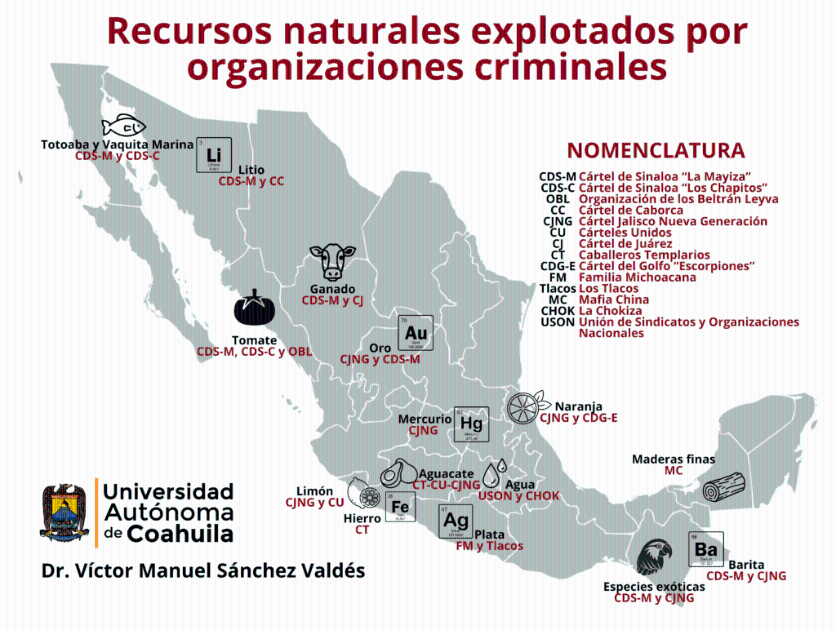 El abanico de recursos naturales es muy amplio, e incluye metales como el oro, la plata, el mercurio, el litio, el cobre o el hierro, minerales como la barita o la fluorita; maderas finas como caoba, ébano, granadillo, ciricote o cedro rojo; animales exóticos como aves, felinos, simios, vaquita marina, pepino de mar o totoaba; cultivos de alta rentabilidad como aguacate, tomate, limón, naranja o frutos rojos, ganado vacuno de engorda, y hasta bienes tan esenciales como el agua en las zonas en donde hay escasez.