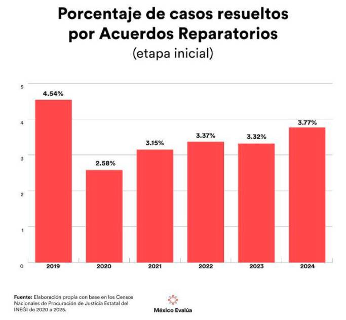 En 2019, que fue el mejor año, sólo 4.54 por ciento del total de casos a nivel nacional se resolvieron por acuerdos reparatorios en fiscalías. Esto sigue muy lejos del potencial de soluciones que debería tener la justicia alternativa. Por ejemplo, en 2023, Yucatán y Chiapas lograron resolver el 44.84 y 33.98 por ciento de sus casos respectivamente por esta figura desde la etapa inicial. Ello demuestra que es posible impulsar este tipo de soluciones, en especial si la naturaleza de los delitos lo permite.