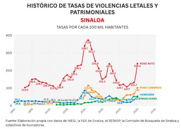 La tasa de robo de vehículo siempre ha sido altísima en Sinaloa (ver gráfica). Es, como explica Marcelo Bergman, un delito adquisitivo que genera altas rentas y dada su enorme impunidad presenta un gran incentivo económico para sus perpetradores.