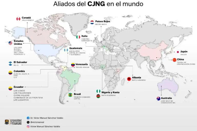 El CJNG tiene una amplia cobertura global, ya que, de acuerdo con la Drug Enforcement Administration (DEA), tiene presencia en más de 40 países y en una investigación propia, a partir de notas de prensa, pude localizar su acción en 61 países de los 5 continentes.