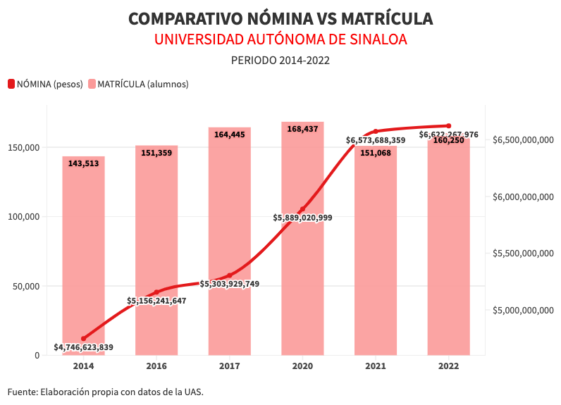 No es así: el problema es que la nómina no ha dejado de crecer en la última década. De enero de 2022 a octubre de 2023 la UAS agregó 2 mil 697 nuevos registros a su nómina activa. Ese crecimiento se concentra en una excesiva contratación de personal de confianza en todas las áreas y niveles. Tan solo en los últimos dos años, el personal de confianza creció en 39 por ciento y su nómina en 49 por ciento, que representan cerca de 85 millones de pesos mensuales.