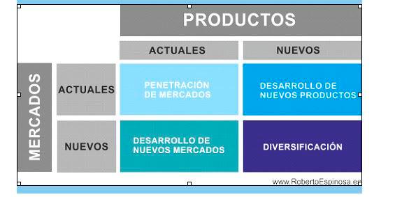 La Matriz relaciona los productos con los mercados, clasificando al binomio producto-mercado en base al criterio de novedad o actualidad. Como resultado obtenemos 4 cuadrantes con información sobre cuál es la mejor opción para seguir: estrategia de penetración de mercados, estrategia de desarrollo de nuevos productos, estrategia de desarrollo de nuevos mercados o estrategia de diversificación.