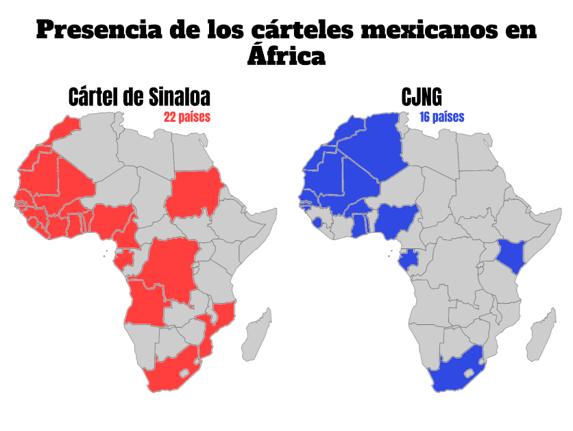 Hoy los dos principales cárteles de la droga, el Cártel Jalisco Nueva Generación y el Cártel de Sinaloa tienen presencia en 16 y 22 países de África respectivamente, tal como lo muestra el siguiente mapa.