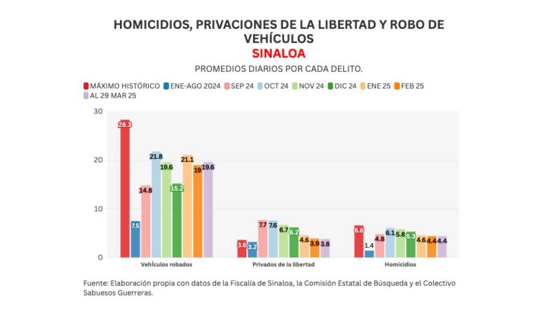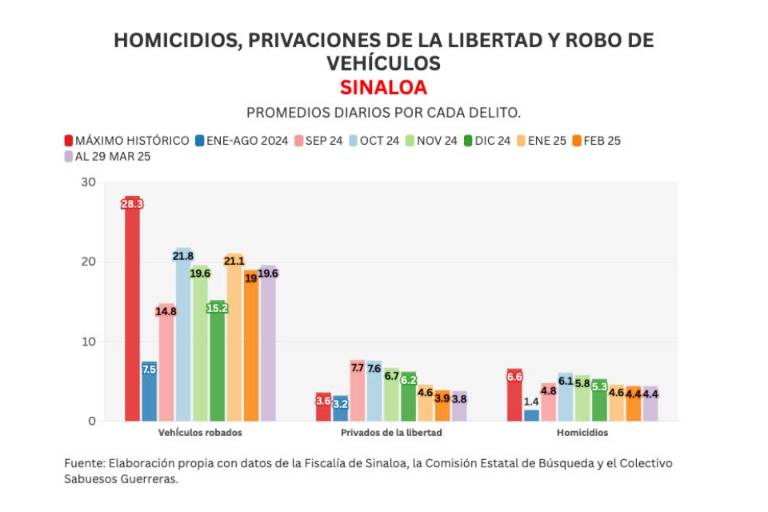 A un día de concluir, el mes de marzo cierra en Sinaloa con 4.5 asesinatos, 3.8 fichas de búsqueda y 19.6 vehículos robados diarios. Con 130 homicidios, 569 robos de vehículos y 110 privaciones de la libertad ocurridos hasta ahora, marzo ya supera a febrero en todos estos delitos.