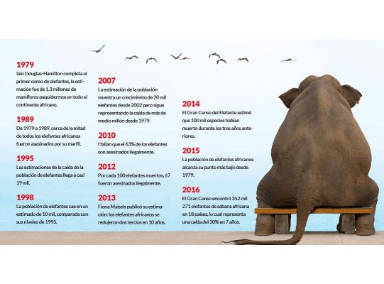 En 1979, Iain Douglas-Hamilton completó el primer censo de elefantes, donde la estimación fue de 1.3 millones de mamíferos paquidermos en todo el continente africano. De ese año, hasta 1989, cerca de la mitad de dicha especie fue asesinada con el único fin de despojarla de su marfil.