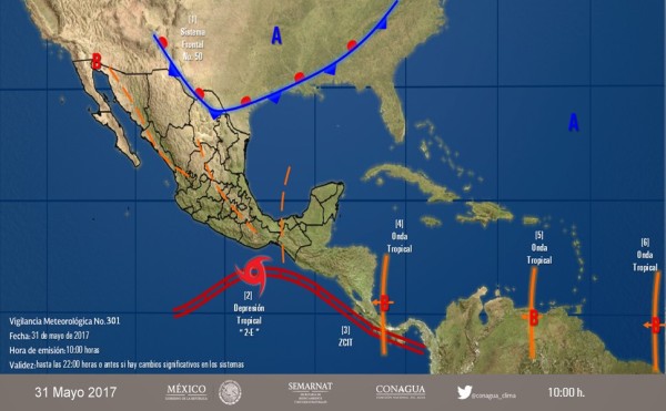 El Centro Nacional de Huracanes de Miami, Florida, en coordinación con el SMN, han establecido una zona de vigilancia por efectos de tormenta tropical desde Salina Cruz hasta Puerto Escondido, Oaxaca.