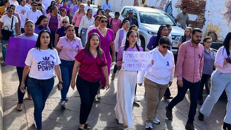 El Sur Con pancartas, los asistentes a la marcha recorren las principales calles de El Rosario.( Foto: Noroeste/Hugo Gómez ) El Sur En Rosario, con una marcha conmemoran el Día Internacional de la Mujer 8 marzo 2024