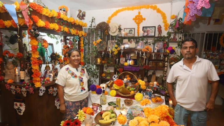 Mazatlán La familia Méndez Tiznado tiene 29 años celebrando la tradición de instalar el altar de muertos.( Fotos: Adán Valdovines ) Mazatlán Con papel picado, flores de cempasúchil y velas, familia recuerda a los que han partido 1 noviembre 2024