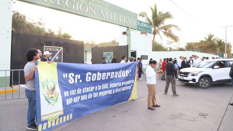 Mazatlán Integrantes de la comunidad de la UAS se manifiestan en la región militar donde estará el Presidente de México.( Foto: Juvencio Villanueva ) Mazatlán Se manifiesta comunidad de la UAS en instalaciones militares en Mazatlán 8 abril 2024
