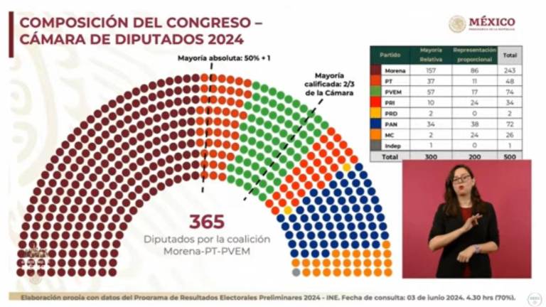 Nacional Posible composición de la Cámara de Diputados después de los resultados de las elecciones del 2 de junio.( Foto: Captura de pantalla ) Nacional AMLO platicará ‘Plan C’ con Sheinbaum; Segob presume mayoría de Morena y aliados en Congreso 3 junio 2024