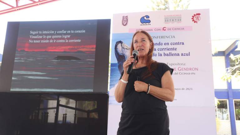 La doctora Diane Gendron, reconocida investigadora del Centro Interdisciplinario de Ciencias Marinas CICIMAR-IPN, impartió la “Navegando en contra de la corriente estudiando la ballena azul”, ante jóvenes estudiantes del Cbtis 51, de Mazatlán.(