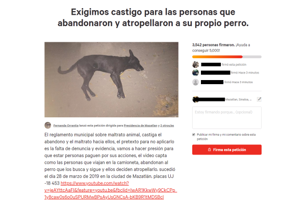 Mazatlán ( Internet ) Mazatlán "Piden en Change.org castigar a quienes atropellaron a un perro en Mazatlán" 30 marzo 2019