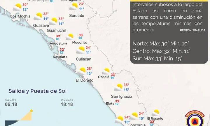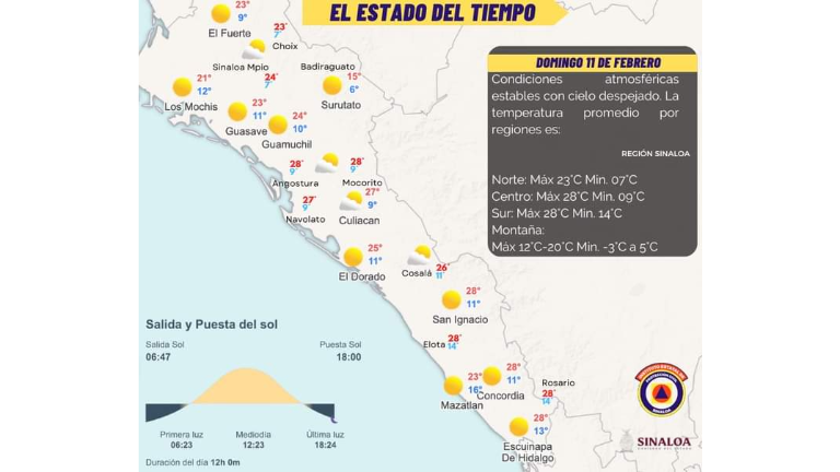 Culiacán Protección Civil Sinaloa pronóstica una tarde cálida con temperaturas que lleguen casi a los 30 grados centígrados.( Foto: Protección Civil ) Culiacán Mañana gélida pero tarde calurosa, el clima de Sinaloa este domingo 11 febrero 2024