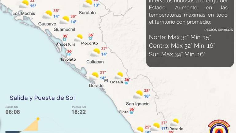 Culiacán Hasta 38 grados centígrados pronostican para Sinaloa durante este viernes 31 de marzo( Foto: Instituto Estatal de Protección Civil. ) Culiacán Mañanas frescas y tardes calurosas, el pronóstico del clima para Sinaloa 31 marzo 2023