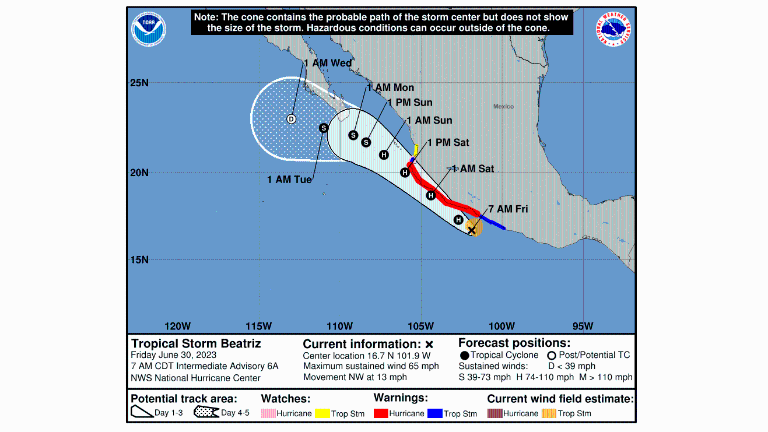 Culiacán Posible trayectoria de la tormenta Beatriz, que está en evolución de convertirse en huracán.( Foto NHC ) Culiacán Vienen lluvias fuertes a Sinaloa desde este viernes 30 junio 2023