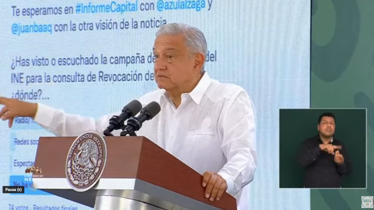 Nacional Conferencia mañanera del Presidente de México desde Veracruz.( Foto: Captura de pantalla ) Nacional AMLO usa un sondeo de Twitter, de solo 74 votos, para desacreditar al INE 18 marzo 2022