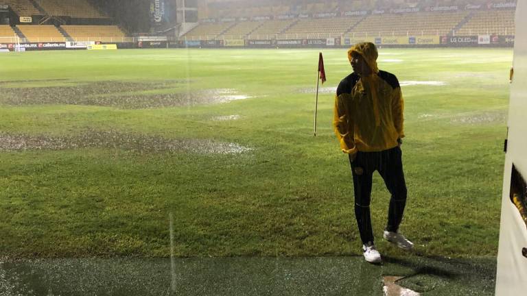 Futbol Los charcos impedían que el balón rodara con normalidad.( Foto: Noroeste/Roberto Armenta ) Futbol Mal clima en Culiacán suspende duelo entre Dorados y Tapatío 17 agosto 2022