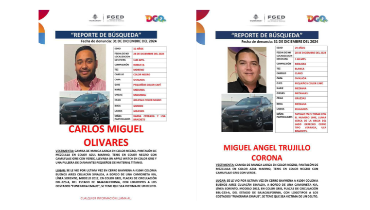 Seguridad Los desaparecidos fueron identificados como Miguel Ángel Trujillo Corona, de 29 años de edad; y Carlos Miguel Olivares, de 32 años.( Foto: Fiscalía de Durango ) Seguridad Desaparecen dos hombres duranguenses en la colonia Buenos Aires, en Culiacán 2 enero 2025