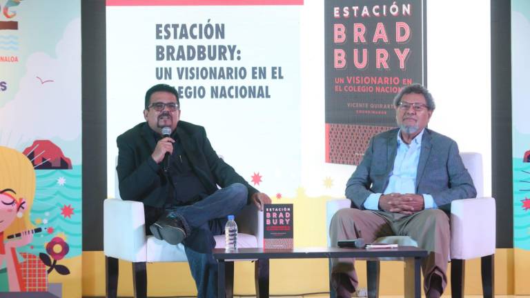 Cultura Juan José Rodríguez y Élmer Mendoza.( Fotos: Noroeste/Rafael Villalba ) Cultura Llega ‘Estación Bradbury: Un Visionario en El Colegio Nacional’, a la FeliUAS 27 abril 2023