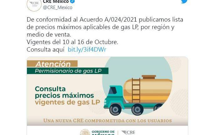 HUB Negocios .( Foto: @CRE_Mexico ) HUB Negocios El precio del gas LP sigue en aumento. CRE comparte lista del 10 al 16 de octubre 10 octubre 2021