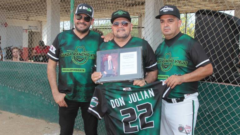 Beisbol Los hijos de Julián Arámburo reciben el reconocimiento póstumo a su padre.( Foto: Noroeste/Andrés García ) Beisbol Rinden homenaje a Julián Arámburo y Germán Lizárraga en la Liga Inter Bandas de Beisbol 29 junio 2022