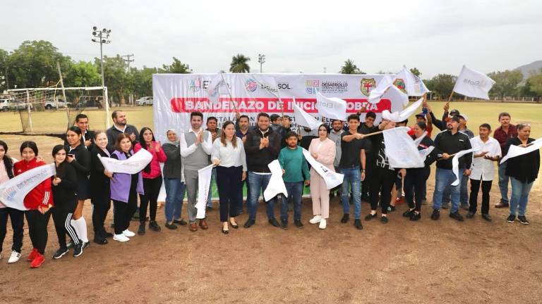 Futbol Ana Karen Val Medina encabeza el banderazo de las obras en el campo de futbol.( Foto: Gobierno de Elota ) Futbol Dan inicio a obras de mejoramiento en campo de futbol de El Espinal, en Elota 16 febrero 2024