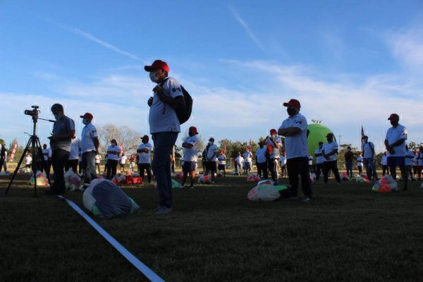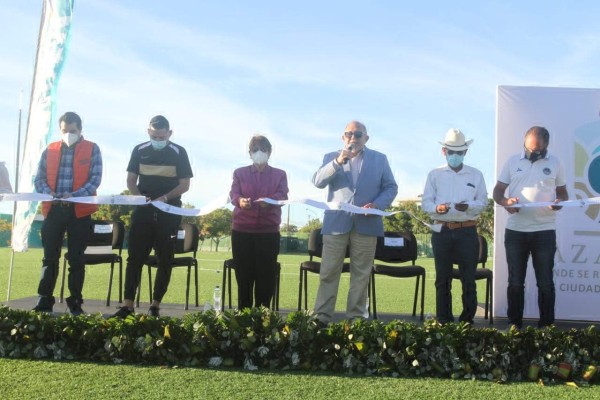 Futbol El corte de listón de la cancha de pasto sintético.( Andrés García ) Futbol "Inauguran cancha de pasto sintético de la Unidad Deportiva Benito Juárez" 21 enero 2021