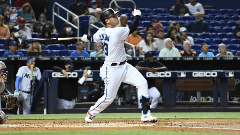 Beisbol Alex Jackson sacó la bola por jonrón para los Marlins de Miami.( Foto: @LosMarlins ) Beisbol Marlins le propina duro revés a Mets en Miami 3 agosto 2021