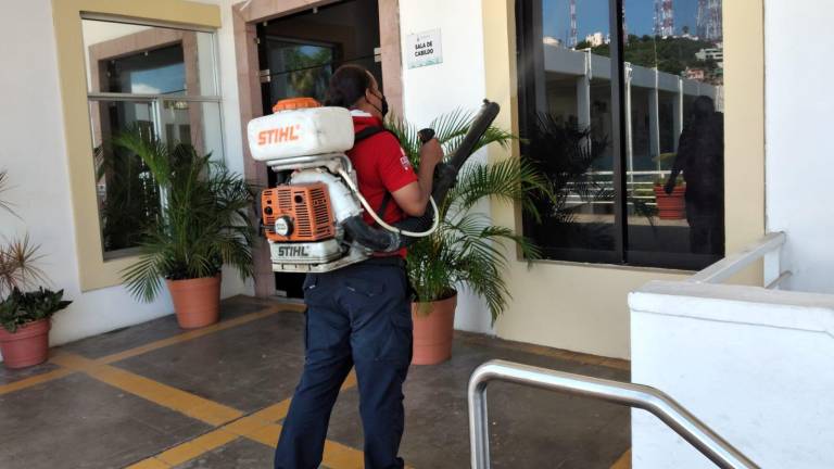 Mazatlán Un empleado de Protección Civil desinfecta oficinas en Palacio Municipal.( Foto: Noroeste / Alma Soto ) Mazatlán Gobierno de Mazatlán reconoce contagios de Covid-19 en dependencias 21 julio 2021