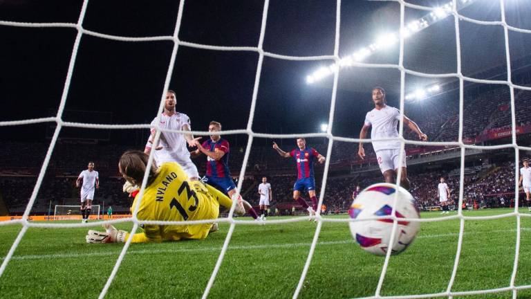 Futbol Sergio Ramos se lamenta luego que el balón terminara dentro de la portería sevillista tras haber sido desviado por él.( Foto: @FCBarcelona_es ) Futbol Autogol de Sergio Ramos regresa al Barcelona al camino ganador 29 septiembre 2023