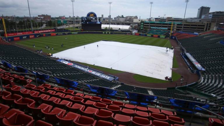 Beisbol El terreno de juego del Sahlen Field luce cubierto con una lona para evitar que se dañe tras la lluvia que cayó en Buffalo.( Foto: Cortesía Las Mayores ) Beisbol Juego entre Rangers y Azulejos fue pospuesto por lluvia 17 julio 2021