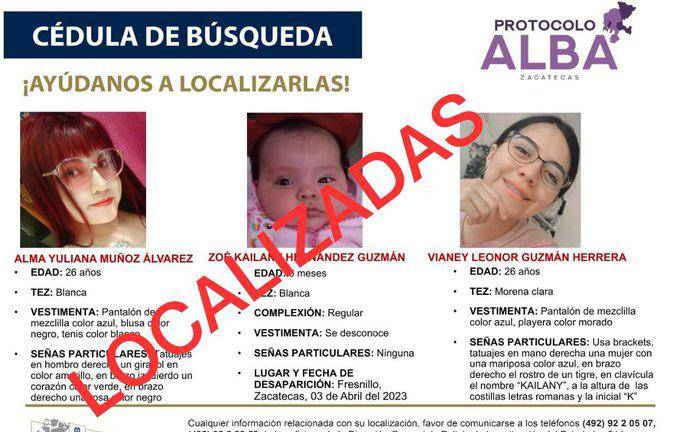 Nacional Las tres mujeres eran buscadas por la Fiscalía de Zacatecas.( Foto: Twitter @FiscaliaZac ) Nacional Esposa e hija de soldado son halladas vivas tras 4 días secuestradas en Zacatecas 7 abril 2023