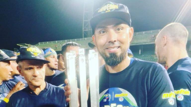 Beisbol Jesse Castillo con el trofeo de campeón.( Foto: Cortesía Algodoneros ) Beisbol Jesse Castillo, refuerzo de Algodoneros de Guasave, es campeón en Venezuela 26 enero 2022