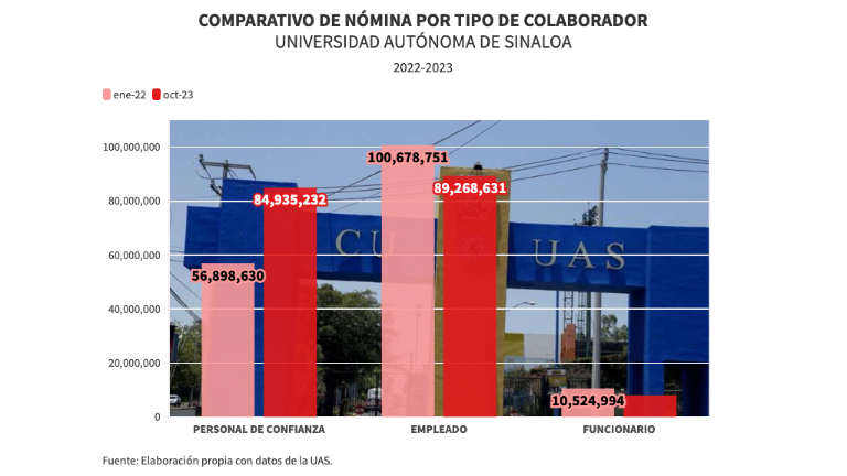 Culiacán Distribución del gasto de la nómina de la UAS en tres categorías.( Foto: Noroeste ) Culiacán ¿Cuántos funcionarios, empleados y personal de confianza tiene la UAS? 30 septiembre 2025