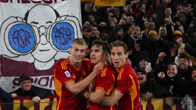 Futbol Paulo Dybala (centro) fue la gran figura en el triunfo de la Roma.( Foto: @OfficialASRoma ) Futbol Roma derrota 3-2 al Torino con un triplete de Dybala 26 febrero 2024
