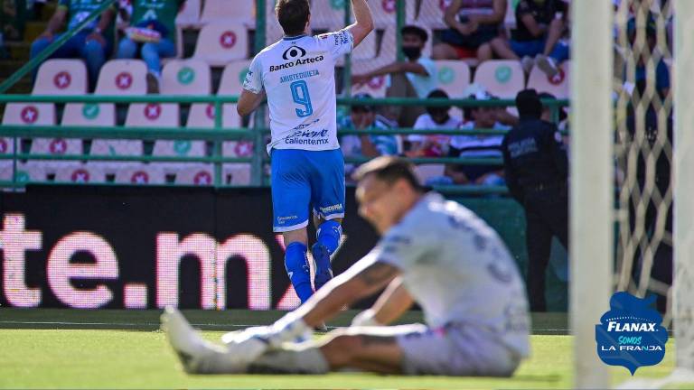 Futbol Fernando Aristeguieta celebra el gol con el que Puebla superó al León.( Foto: @ClubPueblaMX ) Futbol Puebla, con nueve jugadores, saca triunfo ante León, que se quedó con 10 elementos 16 abril 2022