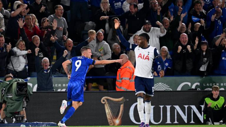 Futbol Jamie Vardy celebra el gol que le otorgó un punto al Leicester City en su regreso a la Premier League.( Foto: @LCFC ) Futbol Tottenham empata 1-1 en Leicester y teme por Bentancur 19 agosto 2024