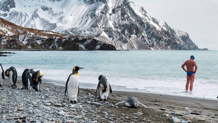 Inndaga Un hombre se prepara para nadar mientras unos pingüinos retozan en una playa de la Antártida.( Foto: PNUMA/Olle Nordell ) Inndaga El deshielo antártico expone al pingüino emperador a la extinción 1 octubre 2023