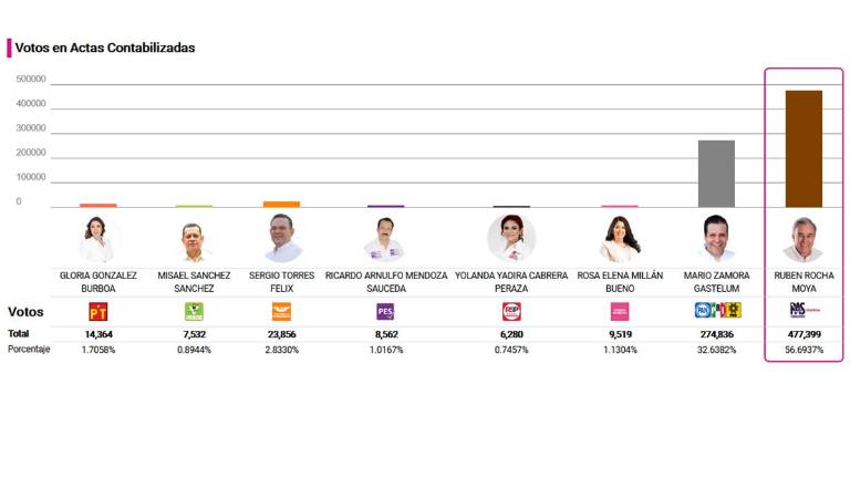 Culiacán Resultados de la elección de Gobernador de Sinaloa capturados en el programa preliminar.( Foto: IEES ) Culiacán En la elección de Gobernador de Sinaloa, Rocha Moya aventaja 2 a 1 en votos sobre Mario Zamora 7 junio 2021