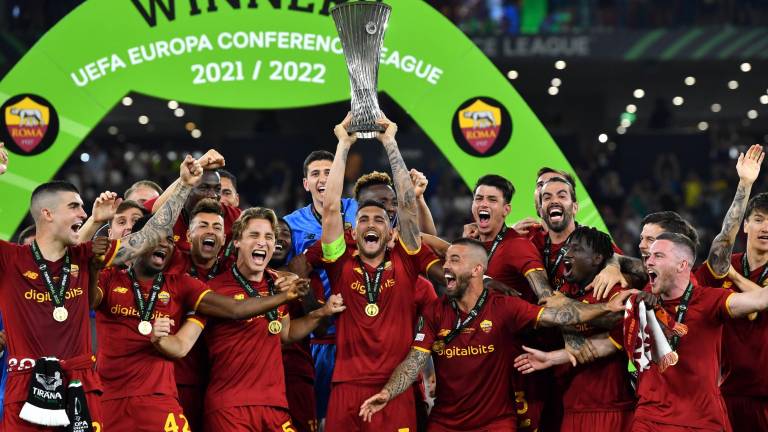 Futbol Los jugadores de la Roma festejan su título.( Foto: Twitter @europacnfleague ) Futbol La Roma es el primer campeón de la UEFA Europa Conference League 25 mayo 2022